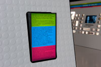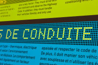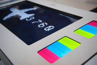 Teilbereiche suggerieren Bewegung, indem sie fragmentarisch »aufscheinen«. Die Schrift auf den gerasterten Böden und Wänden des Ausstellungsraums ist von den Punkteschriften der LED-Anzeigen inspiriert; der Besucher befindet sich gewissermaßen selbst auf einem großen Bildschirm. Die Typographie und die visuelle Kommunikation fügen sich damit logisch in die Ausstellungsarchitektur ein.